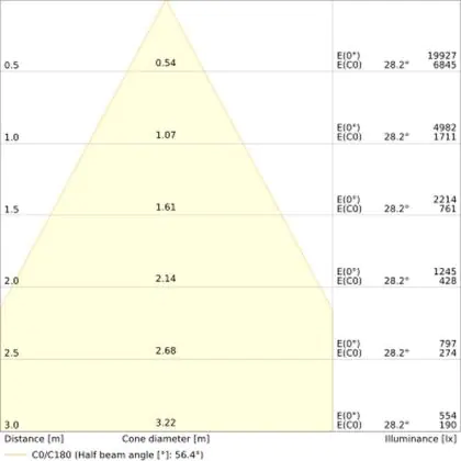 De gradenbundel geeft informatie over hoe breed het licht wordt uitgestraald. Dit zit tussen de 0 en 360 graden (D). Hoe kleiner de hoek, hoe specifieker de lichtbundel is. Over het algemeen is een smalle gradenbundel perfect voor sfeer- of accentverlichting, terwijl een brede gradenbundel ideaal is om grote oppervlaktes te verlichten.