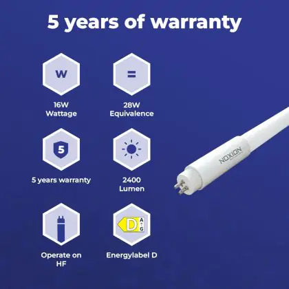 Stap je over van TL-5 TL buizen naar T5 LED, dan is er niets handiger dan deze Noxion T5 LED buis! Voor de installatie heb je enkel een TL armatuur nodig waarin deze LED T5 LED buis Elektronisch (HF), met een lengte van 115cm en een diameter van 18mm, past.