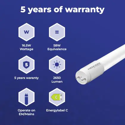 Deze Noxion LED TL buis heeft een Lumen / Watt efficiëntie van lm/W. Dit is de waarde die je verkrijgt door de lichtopbrengst (2650 Lumen) te delen door het wattage (16W) van deze lichtbron. Hoe weet je of jouw lichtbron een goede efficiëntie heeft? In dit geval ligt de lm/W waarde boven de 65. Je kunt er ook voor kiezen om een LED geïntegreerd TL armatuur te kopen. Hierbij heb je de keuze uit diverse (waterdichte) LED montagebalken, die in een divers aantal Lumen verkrijgbaar zijn. Een (dimbaar) LED paneel is ook een slimme optie, met name voor ruimtes met een systeemplafond (eenvoudige installatie) en kantoren (UGR<19 varianten).